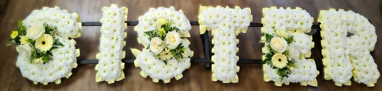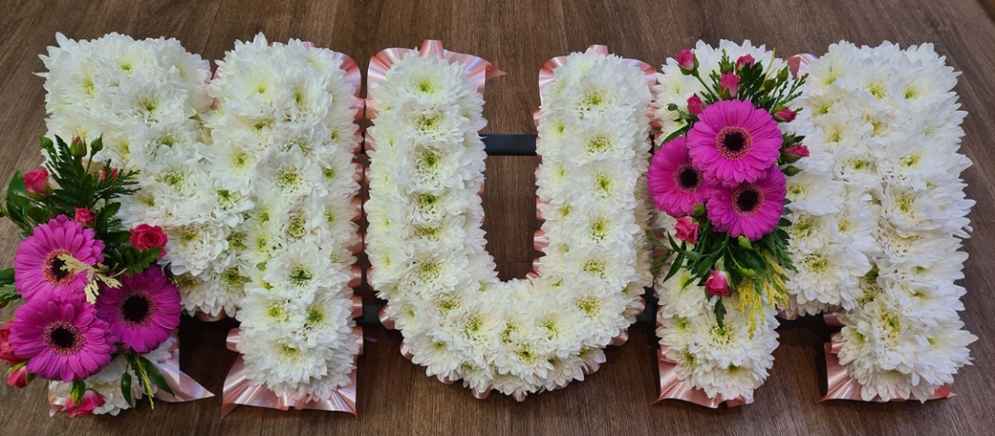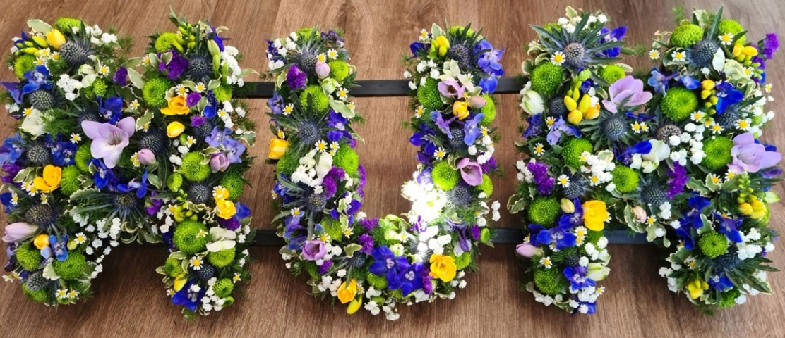 Please note that all the names and letter tributes displayed here require a minimum of 5 working days' notice. This ensures that we have sufficient time to source all the flowers depicted in the pictures, allowing us to create arrangements of the highest quality and beauty.