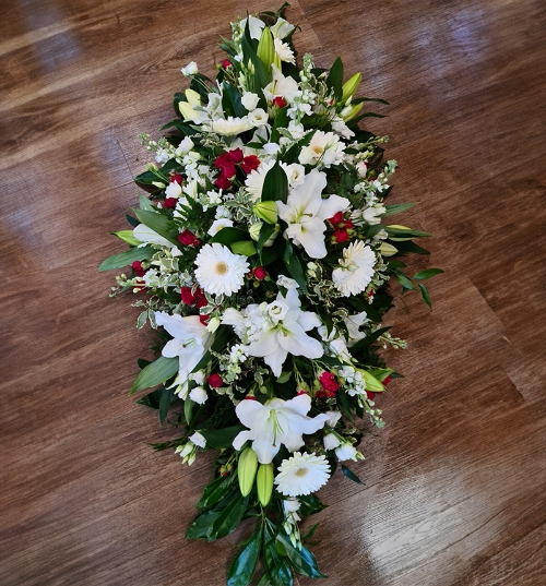 Our "Eternal Peace" casket spray is a poignant tribute, meticulously crafted with pristine white lilies, delicate white lisianthus, and elegant white stocks. Accented with the timeless beauty of red spray roses and the purity of white gerberas, this arrangement offers solace and comfort during moments of grief and loss. Each bloom is carefully selected to honour the memory of your loved one, creating a serene and dignified farewell.