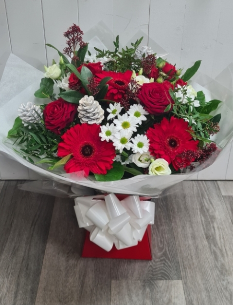 Celebrate the holiday season with the enchanting Snowberry Charm Bouquet. This festive arrangement combines crisp white Santini, bold red gerberas, classic red roses, delicate white lisianthus, frosted white pine cones, and rich red skimmia for a perfect balance of elegance and cheer. Ideal as a holiday gift it brings a touch of winter wonder to any celebration.
